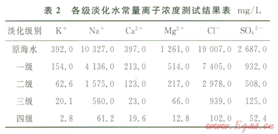 2)對(duì)本方法的海水淡化程度進(jìn)行了分析,海水經(jīng)過多級(jí)淡化,可以獲得了凈化度很高的淡水。在二級(jí)淡化水中,常量離子去除率平均可達(dá)81.0%,而三級(jí)和四級(jí)淡化水的離子去除率則分別達(dá)到了94.8%和98.4%,四級(jí)淡化水所有的離子濃度指標(biāo)均優(yōu)于飲用水標(biāo)準(zhǔn)。