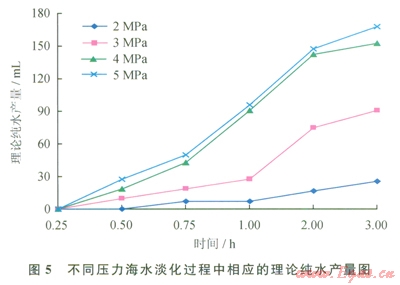 反應(yīng)壓力與理論純水產(chǎn)量的關(guān)系見圖5。由圖5可看出,理論純水產(chǎn)量隨著壓力的升高而不同程度地升高。4MPa環(huán)境壓力的純水產(chǎn)量較2MPa、3MPa有明顯升高,雖然5MPa的純水產(chǎn)量為最高,但是效果與4MPa環(huán)境壓力相差不大。從實(shí)驗(yàn)中可知,環(huán)境壓力4MPa左右可獲得較高的海水淡化效率,同時(shí)成本也不會(huì)太高??紤]到海水深度可提供1MPa左右的環(huán)境壓力。因此,可選定CO2氣體的初始?jí)毫?span lang="EN-US">3~4MPa.