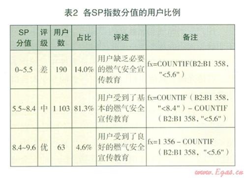采用countif(range,criteria)統(tǒng)計程序,按燃氣知識教育強度(SP)評級,對有效問卷的l 357位用戶進行分類統(tǒng)計得出表2統(tǒng)計結果: