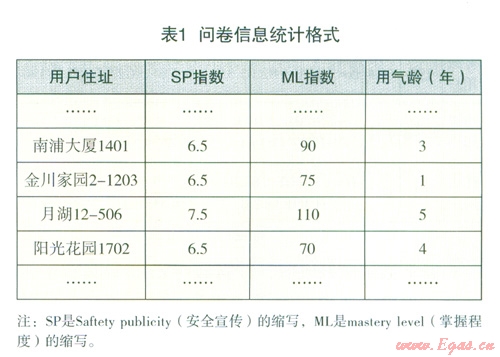 問卷打分采取手工模式,問卷數(shù)據(jù)記錄及統(tǒng)計采用Microsoft Excel,運用軟件中的批量求和程序?qū)?shù)據(jù)進行簡單處理,得出每一個用戶用于表征“燃氣安全宣傳強度”及“燃氣知識掌握狀況”的參數(shù)。統(tǒng)汁格式如表1所示:
