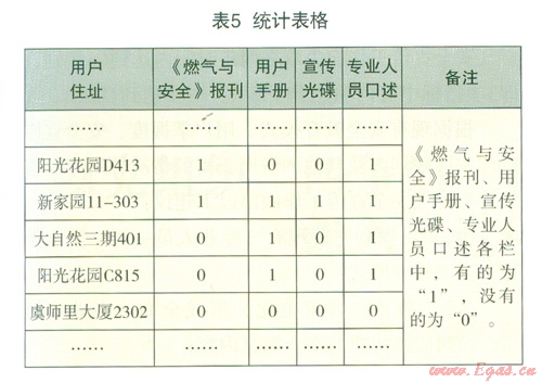 本次問卷中涉及的燃氣安全宣傳知識包括:《燃氣與安全》報刊、用戶手冊、宣傳光碟、工作人員口述。首先通過手工錄入到EXCEL中。如表5