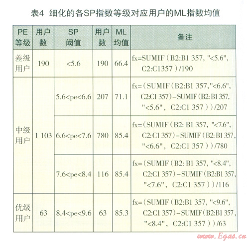 研究方法:對3SP指數(shù)等級的用戶進行統(tǒng)計,分別計算出ML指數(shù)的平均值,再根據(jù)獲得的結果進行分析。統(tǒng)計采用SUMIF程序。如表3