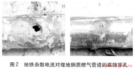 香港曾因地鐵雜散電流引起煤氣管道腐蝕穿孔,造成煤氣泄漏事故;北京、天津地鐵雜散電流已造成隧道內(nèi)水管腐蝕穿孔;據(jù)東北輸油管理局統(tǒng)計(jì),東北地區(qū)共有長輸油管道約2000km,其中80%的腐蝕穿孔事故來自雜散電流的影響[4]。地鐵雜散電流對(duì)埋地鋼質(zhì)燃?xì)夤艿赖母g穿孔見圖2,地鐵雜散電流對(duì)金屬管道的強(qiáng)烈腐蝕作用可見一斑。
