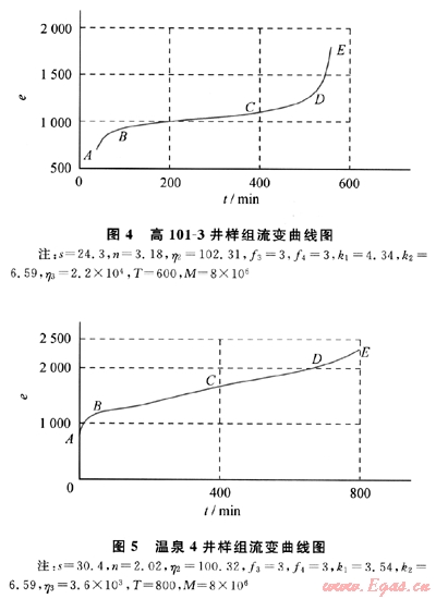 圖4中的AB段是油氣井在外界作用下的減速損傷階段,與承載的時間關(guān)系不大,為瞬間損傷。在第一保護(hù)區(qū)的作用下,損傷速度由大變小,損傷加速度小于0。BC段是油氣井等速損傷階段,此階段流變曲線形似一條直線,損傷速度接近常數(shù),損傷加速度為0。CD段是油氣井加速損傷階段,此階段損傷速度不斷增大,加速度也大于0。AD段是安全流變階段,其中D點(diǎn)是突變警戒點(diǎn),從此點(diǎn)開始油氣井的運(yùn)動開始發(fā)生了質(zhì)變,進(jìn)入了危險狀態(tài)。DE屬于安全突變階段。