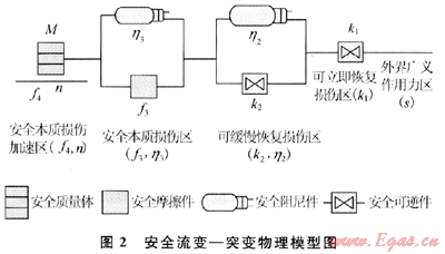 安全流變 突變的物理模型由4組元件組成(如圖2)。整個系統(tǒng)框架模型分為5個層次:外界廣義作用力區(qū)、可立即恢復(fù)損傷區(qū)、可緩慢恢復(fù)損傷區(qū)、安全本質(zhì)損傷區(qū)、安全本質(zhì)損傷加速區(qū),每個層次的反應(yīng)機(jī)理和作用各不相同。事物就是在這種模型下對外界廣義作用力作出相應(yīng)的反應(yīng),最終決定事物是處于安全狀態(tài)還是危險狀態(tài)的。