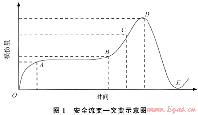 假設(shè)將事物的危險狀態(tài)用損傷程度來表示,那么事物的“安全流變-突變”的全過程可以表述為(如圖1):當(dāng)某一事物誕生后的初期(OA階段),其損傷量在外界力的作用下呈減速遞增,新的狀態(tài)在此期間逐漸形成和完善。當(dāng)新的狀態(tài)發(fā)展到成熟階段時(AB階段),完善的新狀態(tài)使損傷量勻速緩慢增加。當(dāng)經(jīng)過一段穩(wěn)定增加后,原狀態(tài)將再次向無序方向發(fā)展,進(jìn)而使損傷量值開始加速增大(BC段)。任何事物都有其固有的損傷量承受能力或臨界點(diǎn)(D點(diǎn)),超出此臨界點(diǎn)(D點(diǎn))后,事物將發(fā)生安全突變。當(dāng)事物的原狀態(tài)遭到破壞后,事物又重新回到一個新的安全狀態(tài),原事物的狀態(tài)消失,從而又形成了另一個同類新事物誕生的新起點(diǎn)(E點(diǎn))。物質(zhì)世界就是在這種安全與危險的無限循環(huán)中得以存在和發(fā)展的[4]。