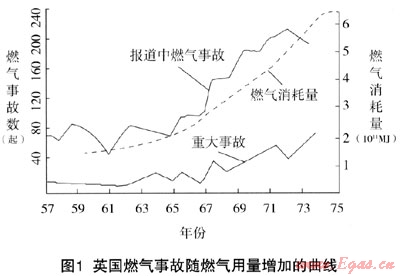 隨著我國城鎮(zhèn)燃?xì)馐褂玫钠占?,室?nèi)燃?xì)馐鹿室矊映霾桓F,如何減少室內(nèi)燃?xì)馐鹿蕩淼纳鼈拓敭a(chǎn)損失是人們持續(xù)關(guān)注的焦點(diǎn)。統(tǒng)計表明,燃?xì)獗ǖ氖鹿蕯?shù)與燃?xì)庥脩艉腿細(xì)庀膸缀醭烧?,如圖1所示為英國燃?xì)馐鹿实慕y(tǒng)計。為了維護(hù)燃?xì)饪蛻舻纳敭a(chǎn)安全,有必要對事故的成因、規(guī)律及危害進(jìn)行分析以找出相應(yīng)的防范措施。本文就是探索這類事故產(chǎn)生和發(fā)展的規(guī)律,提出有效的預(yù)防和控制措施,解決目前燃?xì)庑袠I(yè)亟待解決的居民用戶安全問題,因此具有重大的社會經(jīng)濟(jì)效益。