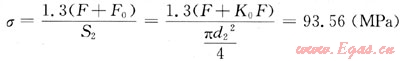 式中F0為螺栓殘余鎖緊力,F(xiàn)0=K0F,N;K0為殘余鎖緊系數(shù),《機(jī)械設(shè)計(jì)基礎(chǔ)》建議K0為1.5~1.8,取K0=1.8;S2為螺栓螺紋小徑處橫截面積,mm2;d2為螺栓螺紋小徑,取d2=mm。