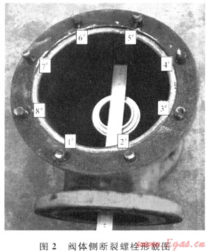 閥蓋上的8個(gè)螺栓光孔均發(fā)生了月牙形磨損或擠壓變形成為橢圓形,其中橢圓長軸沿徑中心。對光孔長軸和短軸進(jìn)行測量并計(jì)算橢圓度,發(fā)現(xiàn)1#、2#、3#、8#光孔比4#、5#、6#、7#光孔橢圓度大(光孔編號(hào)與螺栓編號(hào)一一對應(yīng))。
