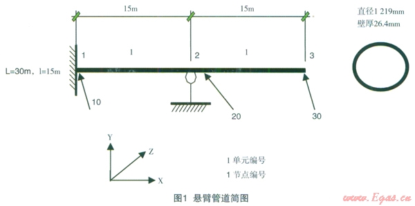 大口徑、厚壁管道,是指鋼管外徑和壁厚之比小于20的鋼管,廣泛應(yīng)用于自來(lái)水、天然氣、石油、化工、醫(yī)藥、通訊、電力、海洋工程等領(lǐng)域。其應(yīng)力分析主要是為了滿足管道設(shè)計(jì)強(qiáng)度和柔性要求,確保管道在各種工況下安全運(yùn)行,而載荷是導(dǎo)致管道內(nèi)產(chǎn)生應(yīng)力的基本原因。大口徑、厚壁管所受的載荷按照載荷性質(zhì)可分為靜載荷、動(dòng)載荷和溫度載荷。為了便于分析,本文只研究管道所受的靜載荷,即對(duì)大口徑、厚壁管進(jìn)行靜力分析。該類管道的靜力分析主要有3類:一是壓力載荷和持續(xù)載荷作用下的管道一次應(yīng)力計(jì)算,為防止塑性變形破壞;二是管道熱脹冷縮以及端點(diǎn)附加位移載荷作用的管道二次應(yīng)力計(jì)算,為防止疲勞破壞;三是管系位移計(jì)算,為防止管道碰撞和支吊點(diǎn)位移過(guò)大。由于管路沿線的地貌復(fù)雜,引起管道應(yīng)力的因素較多,針對(duì)大口徑、厚壁管的應(yīng)力分析,我們主要考慮管系自重、內(nèi)壓和溫度3大要素。下面將以大口徑、厚壁管中的懸臂管道為例,對(duì)CAESARⅡ軟件應(yīng)用于這類管道的應(yīng)力分析作可行性研究。