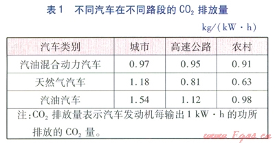 表1表明:a.在城市內(nèi)行駛,汽油混合動力汽車是最清潔的。b.在農(nóng)村地區(qū)、高速公路上行駛時(車速快,發(fā)動機工作),在二氧化碳減排方面,純天然氣汽車優(yōu)于汽油汽車、汽油混合動力汽車。