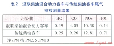 中國汽車技術(shù)研究中心與武漢理工大學等單位采用同規(guī)格的一輛混聯(lián)柴油混合動力客車與一輛傳統(tǒng)柴油客車,在北京通州區(qū)交通部公路試驗場內(nèi),參照《重型混合動力電動汽車能量消耗量試驗方法》(GB/T l9754—2005)及美國SAE—J2711標準《混合動力重型車輛排放性能測試》進行了指定工況下的混合動力汽車場地排放測試,結(jié)果見表2。