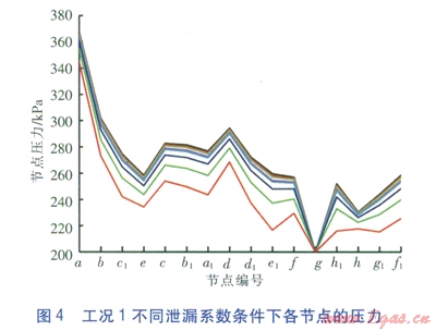 工況l:氣源點入口流量最大為0.4m3/s,負荷點最小壓力不低于200kPa。