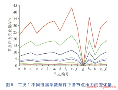 對圖4中的數(shù)據(jù)進行處理求得工況l不同泄漏系數(shù)條件下各節(jié)點壓力相對于正常工況壓力的變化量,即正常工況時節(jié)點的壓力減去泄漏工況時節(jié)點的壓力,見圖6。