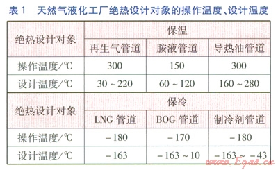 在天然氣液化工廠絕熱設(shè)計中,一般考慮對再生氣、胺液、導(dǎo)熱油等管道進行保溫,對LNG管道、BOG管道、制冷劑管道進行保冷。天然氣液化工廠絕熱設(shè)計對象的操作溫度、設(shè)計溫度見表l。