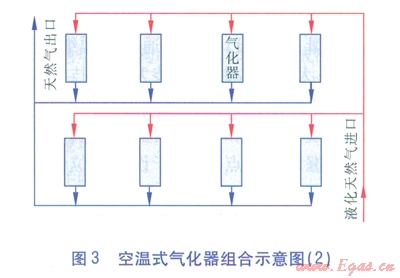 空溫式氣化器的臺數和氣化量,可跟據工程建設規(guī)模和用戶的要求綜合確定??諟厥綒饣鹘M合示意見圖2、3