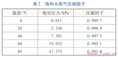 我公司橋東煤氣儲配站的人工煤氣來自邢臺旭陽焦化有限公司,經(jīng)過脫萘、脫硫凈化處理后,主要組成見表l。經(jīng)站區(qū)流量計計量,進入管網(wǎng),輸送至用戶,日均供氣量為17×104m3/d左右,用氣高峰期可達24×104m3/d。主干管采用DN 600mm的螺旋焊縫鋼管,長度約l0km,管網(wǎng)運行壓力為30~70kPa。在計量處測人工煤氣溫度,經(jīng)統(tǒng)計,濕煤氣的溫度不超過50℃,處于水飽和狀態(tài)。表2為0~80℃的飽和水蒸氣壓縮因子值[1]。由表2可知,當(dāng)溫度不超過80℃,水蒸氣的飽和蒸氣壓很低,飽和水蒸氣壓縮因子與l的偏差小于1%,趨于理想氣體性質(zhì)。