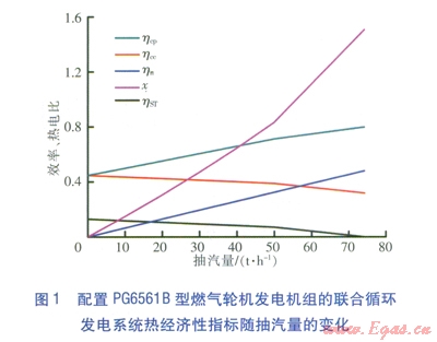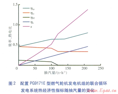燃氣輪機發(fā)電機組在額定工況下運行,改變汽輪機抽汽量,配置兩種燃氣輪機發(fā)電機組的聯(lián)合循環(huán)發(fā)電系統(tǒng)的熱經(jīng)濟性指標分別見圖l、2。
