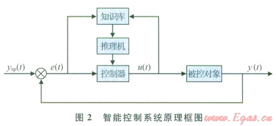 智能控制系統(tǒng)由知識(shí)庫(kù)、推理機(jī)及控制器組成,基本模型見圖2。圖2中u(t)為控制量,e(t)為偏差,ysp(t)為設(shè)定值,y(t)被控參數(shù)如流量、壓力、溫度等??刂屏?span lang="EN-US">u(t)與多種變量或事實(shí)相關(guān),構(gòu)成復(fù)雜的函數(shù)關(guān)系或變化規(guī)則。