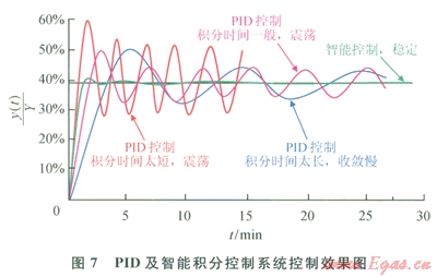 可見,采用智能控制,可使偏差快速穩(wěn)定收斂,當(dāng)[å|e(t)|/n]/Yset≥5%時(shí),采用固定比例控制,當(dāng)[å|e(t)|/n]/Yset≤5%時(shí),采用一定時(shí)間(大約0.5個(gè)波動(dòng)周期)相對(duì)偏差絕對(duì)值的均值(10/Yset)[ å|e(t)|/n]作為改變控制量的隨機(jī)變動(dòng)系數(shù),智能系數(shù)Kint,與E(t)在5%以下時(shí)呈線性遞增關(guān)系,控制量u(t)與E(t)呈非線性遞增關(guān)系。