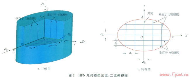 HFN模型考慮了壓裂過程中改造體積的實時擴展以及施工參數(shù)的影響,能夠?qū)σ淹瓿蓧毫堰M行縫網(wǎng)分析,同時可以基于該分析對之后的壓裂改造方案進行二次優(yōu)化設(shè)計。其不足之處在于模擬縫網(wǎng)幾何形態(tài)較為簡單,需借助于地球物理技術(shù)的幫助獲取部分參數(shù),同時由于不能模擬水平裂縫的起裂及擴展問題,及忽略了濾失問題,所以使用時具有較大的局限性。