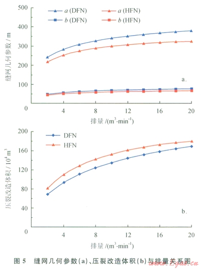 DFN模型和HFN模型計算所得縫網(wǎng)最大縫高分別為27.9m和27.2m,不隨排量的變化而變化。在其他條件相同的情況下,隨著排量的增大,a和b逐漸增大,壓裂改造體積逐漸增大;對于DFN模型,“由243m增加至380m,b由49m增大至76m,壓裂改造體積由68×104m3增大至169×104m3;對于HFN模型,以由218m增加至325m,b由44m增大至65m,壓裂改造體積由82×104m3增大至181×104m3。在相同排量下,利用DFN模型預(yù)測的縫網(wǎng)幾何參數(shù)比HFN模型預(yù)測值大(圖5-a);而利用DFN模型計算的壓裂改造體積比HFN模型計算值小(圖5-b)。