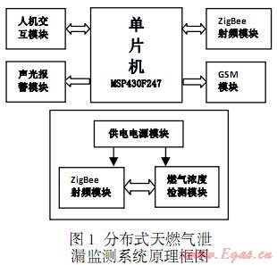 監(jiān)控主機(jī)包括單片機(jī)MSP430F247、人機(jī)交互模塊、聲光報(bào)警模塊、GSM模塊和ZigBee射頻模塊;數(shù)據(jù)采集從機(jī)如右側(cè)所示,包括供電電源模塊、燃?xì)鉂舛葯z測(cè)模塊、ZigBee射頻模塊。數(shù)據(jù)采集從機(jī)放置在管道接口、廚房或燃?xì)忮仩t房等燃?xì)庑孤┲攸c(diǎn)監(jiān)測(cè)區(qū)域,監(jiān)控主機(jī)和多個(gè)數(shù)據(jù)采集從機(jī)之間通過ZigBee射頻模塊實(shí)現(xiàn)數(shù)據(jù)無線傳輸與交換。