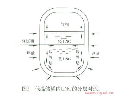 渦旋主要是由于在向盛有LNG的低溫儲罐中充注新的LNG液體或者LNG中氮蒸發(fā)而使儲罐內(nèi)的液體發(fā)生分層。分層液體在儲罐周邊漏熱的作用下,形成各自獨(dú)立的自然對流循環(huán),進(jìn)而使各層液體的密度不斷發(fā)生變化,見圖2。當(dāng)相鄰兩層液體的密度近似相等時(shí),兩個(gè)液層就會(huì)發(fā)生強(qiáng)烈混合,下層積聚的熱量突然釋放出來,同時(shí)伴隨著LNG表面蒸發(fā)率的驟增,幾乎可達(dá)到正常情況下蒸發(fā)率的250倍。蒸發(fā)產(chǎn)生的大量氣體,引起儲罐內(nèi)壓力突然增大,導(dǎo)致大量天然氣排空,造成嚴(yán)重浪費(fèi),甚至可能毀壞儲罐及工藝系統(tǒng),引起爆炸或火災(zāi),嚴(yán)重威脅人員和財(cái)產(chǎn)安全。