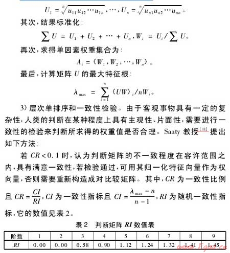 2)構(gòu)造判斷矩陣并求最大特征根。根據(jù)已建立的因素層次分析結(jié)構(gòu)圖對各影響因素進(jìn)行兩兩對比分析,構(gòu)造判斷矩陣進(jìn)行計算,求解判斷矩陣的最大特征根λmax及與其對應(yīng)的正規(guī)化特征向量,具體計算步驟為:首先,計算各行中元素乘積的n次方根: