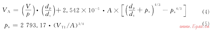 式中V為L(zhǎng)NG儲(chǔ)罐內(nèi)的氣相空間,m3;p為L(zhǎng)NG儲(chǔ)罐內(nèi)的操作壓力(絕壓),Pa;dp/dt為大氣壓力變化速率,Pa/h;ps為L(zhǎng)NG儲(chǔ)罐內(nèi)氣液界面的過(guò)飽和壓力,Pa;VT1為L(zhǎng)NG儲(chǔ)罐滿罐靜態(tài)蒸發(fā)率的一半(即對(duì)應(yīng)于儲(chǔ)罐內(nèi)僅有20%LNG時(shí)的液位),kg/h;A為L(zhǎng)NG儲(chǔ)罐內(nèi)氣液界面面積,m2