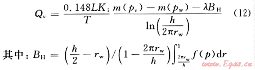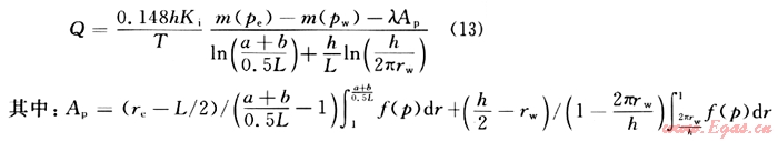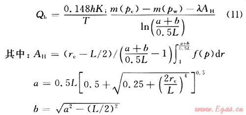 ,從而將長半軸為a、短半軸為b的橢圓形區(qū)域變換成半徑為(a+b)/(0.5L)的圓形區(qū)域,將線段(-L/2,0)到(L/2,0)映射成單位圓周在ξ平面內的流動,可以認為是半徑(n+b)/(0.5L)的圓形供給區(qū)域內有一口半徑為1的直井的情形。此時,水平平面上的啟動壓力梯度就變?yōu)椋?img src="/d/file/2d50a8431d038fbb7a18ec760af0c76d.gif" />,得水平井在水平面的流量為: