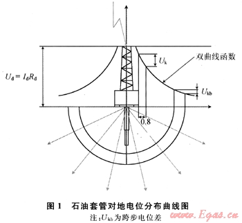 井架和石油套管遠(yuǎn)遠(yuǎn)超出常規(guī)的接地體尺寸,因此一般認(rèn)為石油鉆機(jī)井架就是最好的巨型避雷針,石油套管就是最好的巨型接地體。當(dāng)鉆臺(tái)上工頻下某相絕緣破壞或設(shè)備外殼帶電時(shí),觸摸帶電設(shè)備外殼時(shí)的接觸電位為Ud,身體站立處的電位為U1: