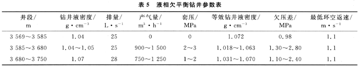 2) 提高了機械鉆速,延長鉆頭壽命。欠平衡鉆進(jìn)過程中,鉆井液循環(huán)壓力低于地層壓力,消除了正壓差對巖屑的壓持效應(yīng),避免了巖石的重復(fù)研磨,提高了機械鉆速,延長了鉆頭壽命。欠平衡井段3569.2~3750.0m,進(jìn)尺180.80m,純鉆進(jìn)86.67h,平均機械鉆速2.09m/h,使用萬216mm牙輪鉆頭一只,鉆時超過6m/h的段長就有31m。