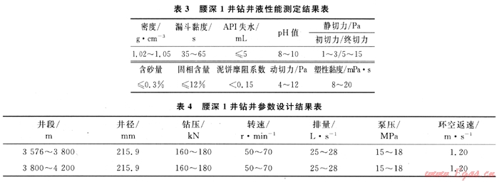 從腰深1井鄰井DB2井和DB11井情況來看:①DB2井在鉆進(jìn)至嫩江組、姚家組地層時,出現(xiàn)垮塌掉塊現(xiàn)象;②DB11井鉆進(jìn)至4002.07m時出現(xiàn)井內(nèi)垮塌現(xiàn)象,經(jīng)調(diào)整鉆井液性能后返出大量巖屑,井下才恢復(fù)正常。從腰深1井地層巖性預(yù)測結(jié)果可知,欠平衡鉆井井段存在泥巖層,易吸水膨脹而產(chǎn)生剝落掉塊、垮塌。從鄰井分析和腰深1井巖性預(yù)測均表明,在欠平衡井段應(yīng)選用防塌性能好的鉆井液體系,為此決定采用聚合醇抑制型防塌鉆井液體系。