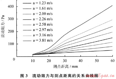 由式(1)可以看出,阻力應該與距離成正比。分析造成上述實驗現(xiàn)象的原因是:實驗中放置泡沫陶瓷的鋼管與高壓氮氣瓶連接需要變徑,氣流在異徑處附近的流速分布不是充分發(fā)展紊流,流速分布不對稱,有畸變,還可能有漩渦、回流,在測點處的流速偏小,曲線向速度較低的曲線靠近,形成了圖3中與測點A的距離小于30mm時的流動阻力形態(tài)。因此,在以下分析中,僅對測點距離大于30mm的數(shù)據進行分析,即對測點距離小于30mmm的泡沫陶瓷流動進行調整,以此來消除異徑對測量結果的影響。