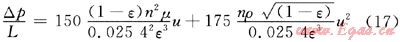 若氣流在顆粒填充床與泡沫陶瓷中的流動阻力相當,空隙率和比面積相等,則由式(6)、(14)得: