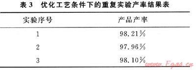為了驗(yàn)證正交實(shí)驗(yàn)優(yōu)化出來(lái)的工藝條件的可靠性,在該條件下又進(jìn)行了3次重復(fù)實(shí)驗(yàn),得到的產(chǎn)率結(jié)果如表3所示。