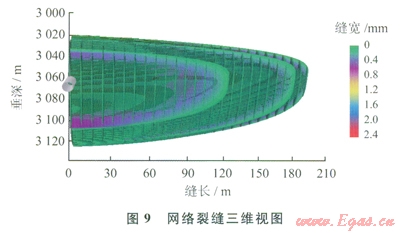 以優(yōu)化得到的高滲透帶長(zhǎng)度、滲透率為目標(biāo),借助頁巖壓裂設(shè)計(jì)軟件對(duì)不同液量、不同砂量下的壓裂網(wǎng)絡(luò)裂縫參數(shù)進(jìn)行模擬。模擬發(fā)現(xiàn):改造體積與液量成正相關(guān)關(guān)系,縫網(wǎng)長(zhǎng)度與前置液成正相關(guān)關(guān)系,它們均與砂量無關(guān),給定液量下裂縫導(dǎo)流能力與加砂量成正相關(guān)關(guān)系。最終在總液量為l600m3、總砂量為53m3下得到縫長(zhǎng)202m,改造體積102×104m3 (其小于地質(zhì)模型中改造體積的原因在于模擬得到的裂縫網(wǎng)絡(luò)為橢球形,而地質(zhì)模型中的等效高滲透帶為長(zhǎng)方體,后續(xù)研究中將對(duì)地質(zhì)模型進(jìn)一步改進(jìn)),縫網(wǎng)平均導(dǎo)流能力為0.039D·cm,平均縫網(wǎng)寬度為0.37mm,結(jié)合縫網(wǎng)參數(shù)計(jì)算得到等效滲透率為4.49mD,滿足設(shè)計(jì)要求。模擬得到的網(wǎng)絡(luò)裂縫參數(shù)如下:裂縫網(wǎng)絡(luò)長(zhǎng)404m,裂縫網(wǎng)絡(luò)寬40m,裂縫網(wǎng)絡(luò)高92m,平均DFN寬度為0.37mm,改造體積(SRV)1025500m3,DFN體積為43lm3,DFN平均導(dǎo)流能力為0.0397D·cm,等效滲透率為4.49mD。網(wǎng)絡(luò)裂縫形態(tài)如圖8、9所示。