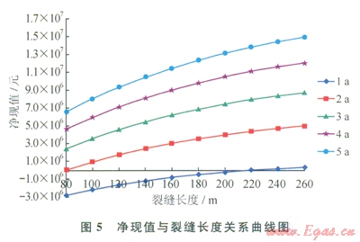 結(jié)合經(jīng)濟(jì)評(píng)價(jià)模型,通過模擬高滲透帶長(zhǎng)度為80~260m下的產(chǎn)量,利用凈現(xiàn)值法優(yōu)選裂縫長(zhǎng)度,凈現(xiàn)值表達(dá)式為: