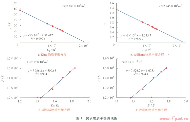 根據(jù)上述數(shù)據(jù),利用King物質(zhì)平衡方程、williams物質(zhì)平衡方程、劉鐵成物質(zhì)平衡方程及筆者提出的改進(jìn)的物質(zhì)平衡方程,計算了該實例頁巖氣井的原始地質(zhì)儲量(1)。