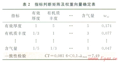 根據(jù)前述選取的指標(biāo)體系,通過調(diào)查專家意見,并參考專家以前在頁(yè)巖氣選區(qū)時(shí)賦予指標(biāo)不同的權(quán)重值,計(jì)算了各個(gè)指標(biāo)的權(quán)重。建立指標(biāo)兩兩判斷矩陣,計(jì)算最大特征值并檢驗(yàn)判斷矩陣的一致性(2)。驗(yàn)證結(jié)果表明:矩陣具有滿意的一致性,層次分析法得到的指標(biāo)權(quán)重為:waj(0.174,0.0770.105,0.313,0.206,0.079,0.047)