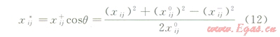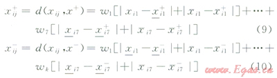 314計(jì)算待評(píng)價(jià)區(qū)塊與正負(fù)靶心之間的靶心距設(shè)正、負(fù)靶心距分別為xij+、xij-。即