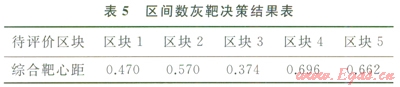 投影長(zhǎng)度(xij*)記為綜合靶心距。綜合靶心距計(jì)算結(jié)果如表5所示。由區(qū)間數(shù)灰靶決策模型得到的結(jié)果為:x*min(xij*)0.374。該結(jié)果對(duì)應(yīng)的足區(qū)塊3。因此,區(qū)塊3為資源勘探開發(fā)潛力評(píng)價(jià)最優(yōu)區(qū)塊。