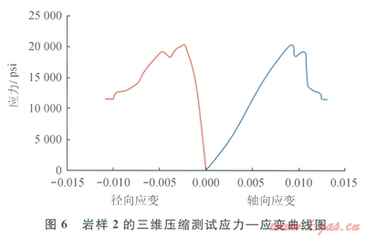 三維壓縮實(shí)驗(yàn)應(yīng)力  應(yīng)變曲線如圖5、6所示。巖石材料的塑性與脆性可根據(jù)應(yīng)力、應(yīng)變曲線上負(fù)坡的坡降大小來劃分。負(fù)坡較陡者為脆性,反之為塑性。由圖5、6可知:巖樣1和巖樣2在應(yīng)力分別為l2000psi(1psi6.895kPa)20000psi時(shí),應(yīng)變?yōu)?span lang="EN-US">0.01、0.009時(shí)破碎,屬于脆性巖石,且?guī)r樣2應(yīng)力、應(yīng)變曲線上的負(fù)坡較陡,故其脆性優(yōu)于巖樣1。