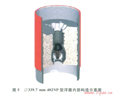Æ339.7mm和Æ508.0mm的套管鉆井所使用的浮箍,前者的型號為402NP型(圖5),后者的型號為402型。這2種浮箍的最大特點是:超密Ⅲ型(Sure-Seal 3TM)單流閥,性能優(yōu)良,可以耐受長時間大排量鉆井液的沖刷。另外402NP型有l個花瓣狀的承接盤,可以保證在下一次開鉆被鉆掉時,膠塞不發(fā)生旋轉(zhuǎn)[12-14]。
