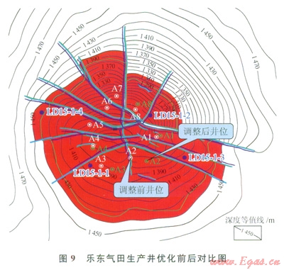 如前所述,筆者工作中采用的3種改進(jìn)方法均能有效地提高斷層,特別是微、小的解釋精度,但單一的方法有時還是會難以給出最優(yōu)解釋方案。因此,工作中結(jié)合了常規(guī)的斷層解釋方法和這3種特殊的解釋手段。經(jīng)多體綜合解釋得到樂東15-l穹隆背斜構(gòu)造的斷層空間展布和組合關(guān)系,這為氣田的開發(fā)方案優(yōu)化提供了可靠的基礎(chǔ)。圖9是結(jié)合筆者斷層描述結(jié)果優(yōu)化前后的樂東15-1氣田開發(fā)井對比圖,從圖9中可以看到,優(yōu)化后的井位規(guī)避了生產(chǎn)井鉆到斷面的風(fēng)險,同時確保了每個儲量規(guī)模大且又相對獨立的斷塊均有生產(chǎn)井動用到。此外,在生產(chǎn)井軌跡優(yōu)化過程中還考慮到了斷面空間分布對后期生產(chǎn)井側(cè)鉆的影響。