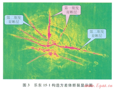 樂東l5-1構(gòu)造中的每條斷層因其所處位置的差異。所受泥底辟應(yīng)力的作用也存在差異。因此,各斷層的特征和活動強度也各不相同。總體上說,斷距在背斜頂部最大,向翼部斷距逐漸變小直至消失,斷層延伸長度最大約6.5km,落差為0~180m。