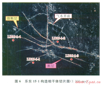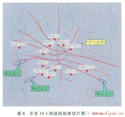圖7是樂東l5-1氣田80Hz單頻相位體切片,圖中可以看到,原地震剖面所識別斷層延長線上,相位資料還明顯發(fā)生扭動或錯斷,因此可解釋出常規(guī)資料和方法無法識別的微、小斷距的斷層,使得原有多條斷層的解釋方案向外延伸,致背斜構(gòu)造北部的平面分塊更可靠,背斜的南部也在橫向上分成了4~5個斷塊,合理的解釋了構(gòu)造南部各井氣體組分差異的原因。