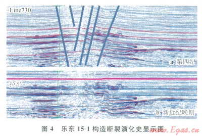 樂東l5-1構(gòu)造底辟的活動[8]分為兩個期次,導(dǎo)致斷層的發(fā)育也分為兩個期次。第一個活動期次是在新近系晚期,在第四紀(jì)前結(jié)束;因此,受本期底辟活動影響而發(fā)育的斷層組在新近紀(jì)以后也基本停止活動(圖4-b),該組斷層走向近似南北向(圖3);到第四紀(jì)早期,底辟活動加劇,發(fā)育更多斷層且斷距較之前發(fā)育的斷層增大(圖4-a);第四紀(jì)中晚期以后,泥底辟活動漸趨減弱或停滯,斷層活動也基本停止。第四紀(jì)發(fā)育的斷層以穹隆背斜的中心為圓點,向四周放射狀分布,且均為正斷層。南北向的斷層由于形成時間相對較早,被后期近東西向的斷層切割。