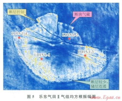 研究認(rèn)為[9]:在泥底辟活動過程中發(fā)育的斷層,由于塑性流體的活動,造成斷層泥在斷面上的涂抹較為均勻,而大幅提升了斷層的側(cè)向封堵能力。地震資料顯示并經(jīng)鉆井資料所證實,放射狀分布的斷層將樂東氣田平面上分隔多個氣藏,背斜北部各斷塊氣藏間的氣水界面不同、氣體的組分也存在差異,這樣的氣藏分布導(dǎo)致了開發(fā)井的動用效率低,難以提高氣田開發(fā)的采收率。在背斜南部l、3、4井區(qū)從地震屬性平面圖分析應(yīng)該屬同一氣藏,且利用常規(guī)資料和方法解釋得到的斷層分布圖也顯示,各塊低部位的氣藏是連通的,基本可以判斷為同一氣藏(圖5)。但l、3、4井資料顯示各井的氣體組分差異較大,其中1井CO2含量16.7%、4井CO2含量70.4%、3井CO2含量79.7%,難以劃歸為同一氣藏。因此,推測還存在一些常規(guī)手段和方法無法解釋的小斷層或微斷層將背斜南部分隔成至少3個獨立氣藏,而這些可疑微、小斷層的不確定性就嚴(yán)重影響對氣田的認(rèn)識和生產(chǎn)井的合理部署。